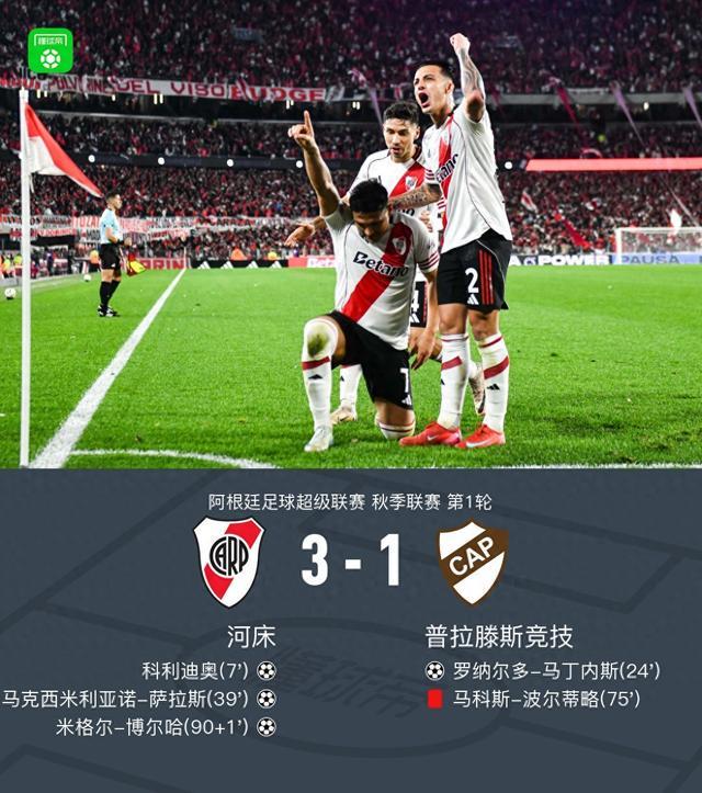北京时间7月14日,阿根廷足球超级联赛秋季联赛第1轮,河床坐镇主场迎战普拉滕斯竞技。比赛第7分钟,保罗-迪亚斯送出助攻,科利迪奥为河床首开纪录。第24分钟,马伊内罗助攻罗纳尔多-马丁内斯破门,普拉滕斯竞技扳平比分。第39分钟,马克西米利亚诺-萨拉斯射门得手,帮助河床再度领先。易边再战,第75分钟,普拉滕斯竞技球员马科斯-波尔蒂略被红牌罚下。补时阶段,皮蒂-马丁内斯送出助攻,米格尔-博尔哈破门,将比分最终锁定在3比1。全场比赛结束,河床取得新赛季开门红。